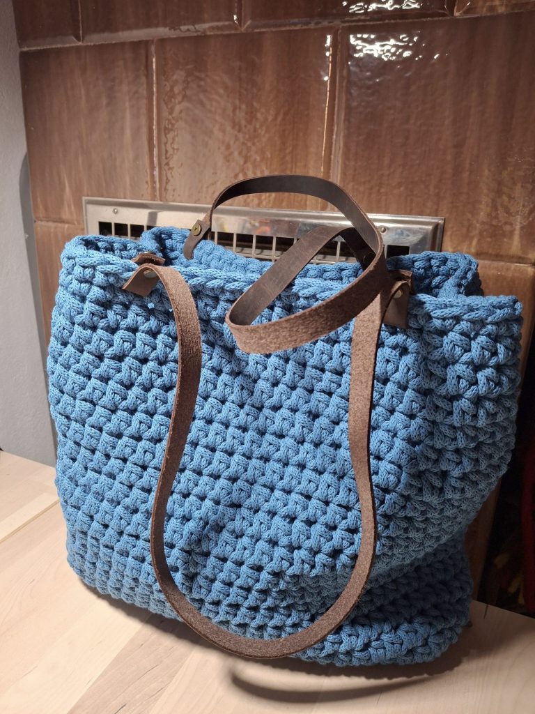 Diese Tasche ist aus einer Kordel gehäkelt.
