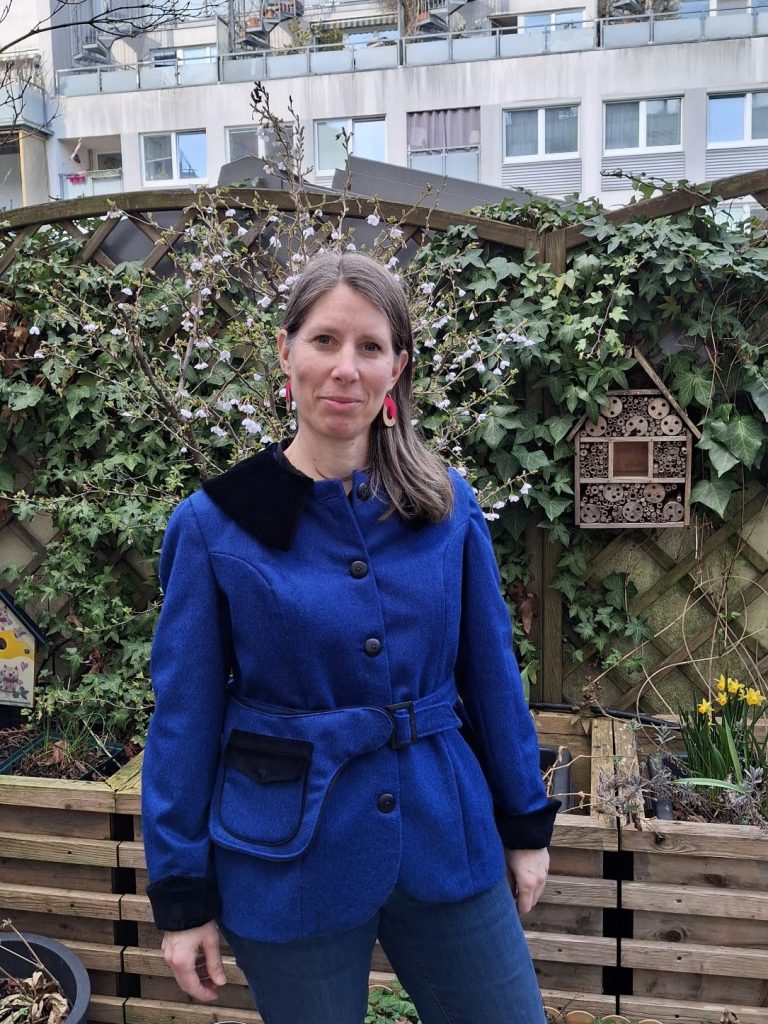 Weil ich auf der Haut sehr empfindlich bin, ist der Kragen aus schwarzem Samt. Die Jacke hat an der Seite zwei Paspeltaschen.