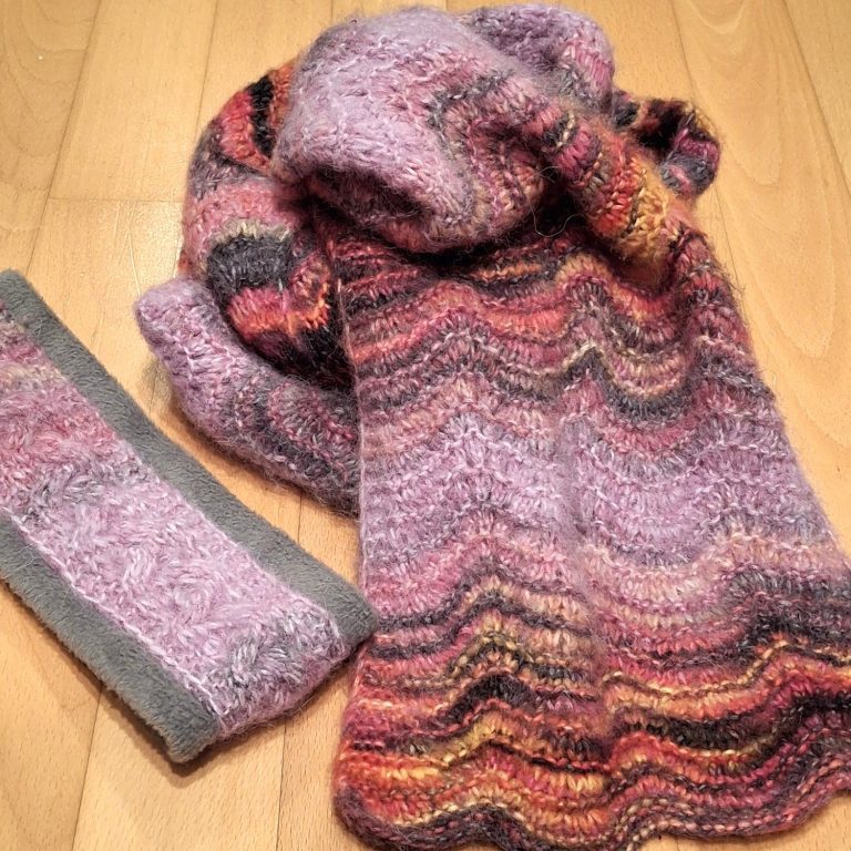 Den Schal habe ich mit einer Anleitung aus einem Lana Grossa Heft gestrickt. Das Stirnband nach irgendeinem Zopfmuster. Unterlegt habe ich es mit einem kuscheligen Sweatstoff.